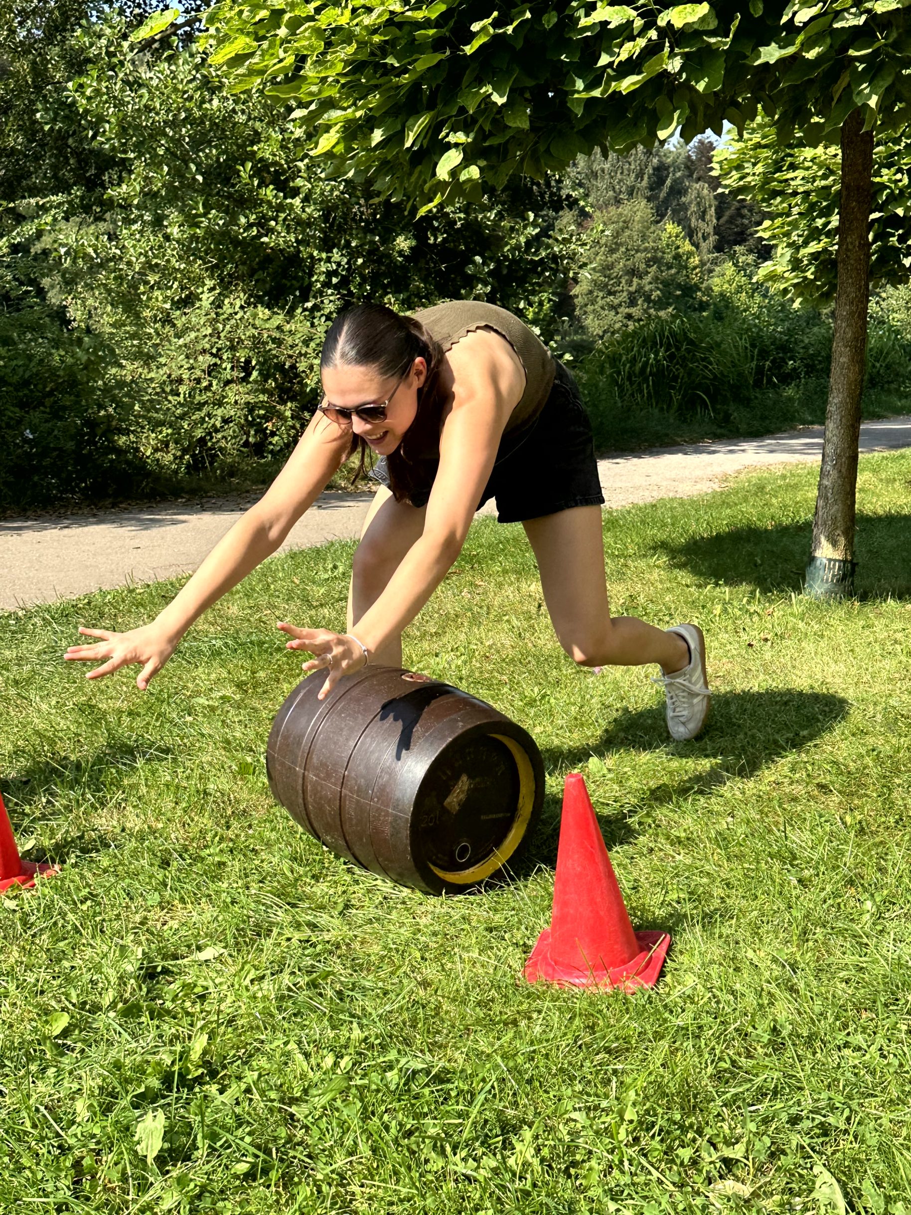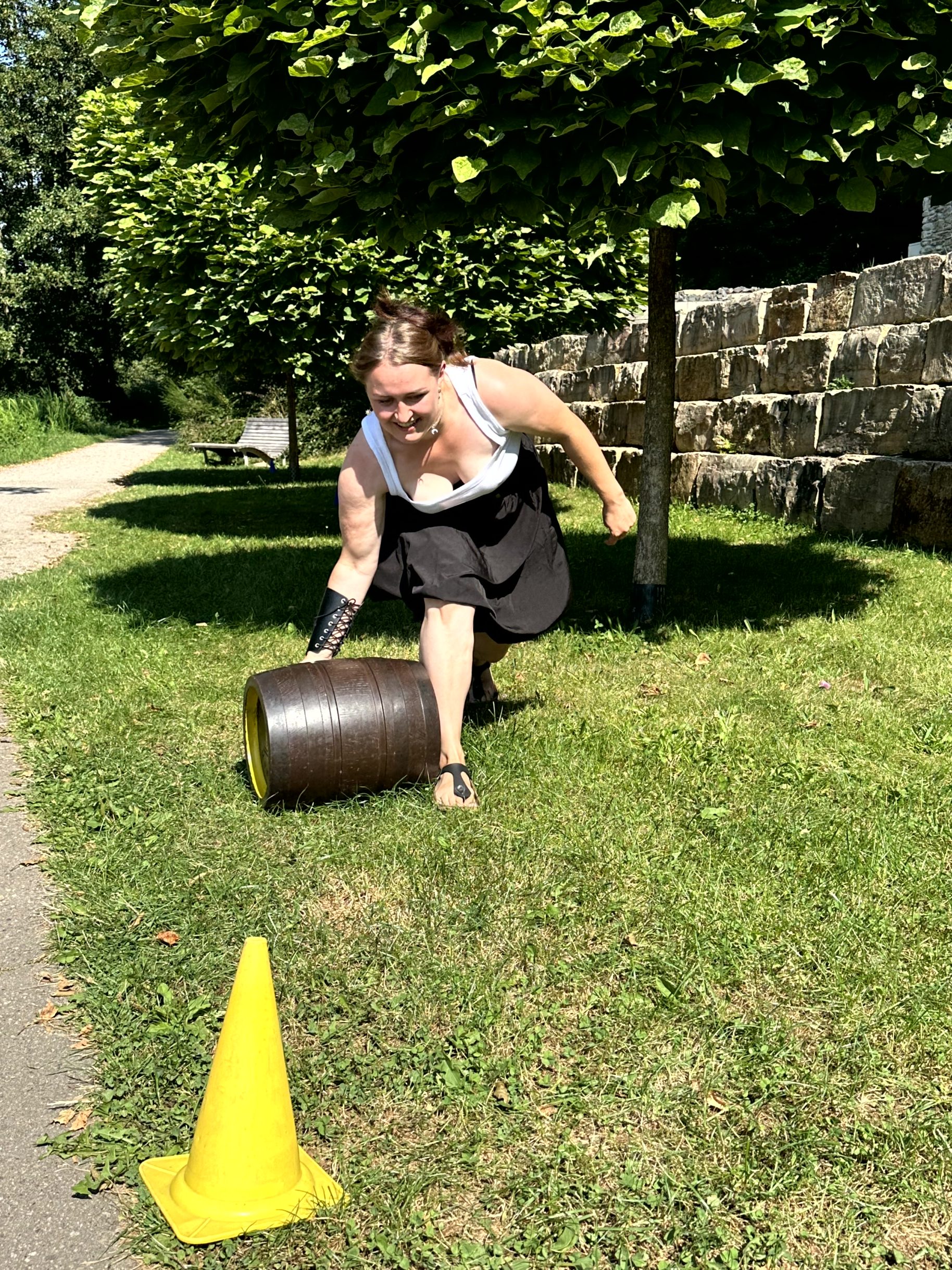 Eine Ritterolympiade wartete auf uns mit Maßkrugschieben, Nagelschlagen, symbolischer Burggrabenüberquerung, Ring werfen (wird mit der Lanze gefangen), Bierfassrollen, Hufeisenwerfen, Turm stapeln und Holzstammschätzsägen. Das Bierfassrollen lieferte auf jeden Fall die dynamischsten und lustigsten Ergebnisse.